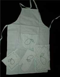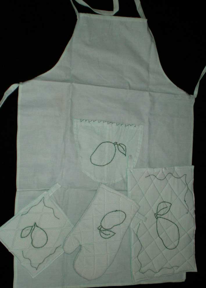 Dit keukensetje (bestaande uit: schortje, ovenwant, pannenlap en pannenonderzetter) is te bestellen.